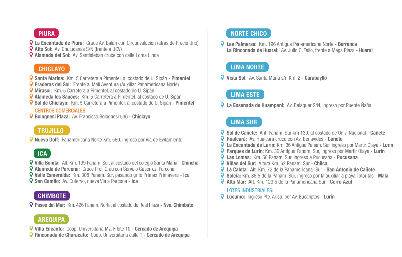 Conoce la ubicacin e informacin de contacto de nuestras Casetas de Venta a nivel nacional donde podrs consultar los precios y detalles de cada proyecto, recibir una visita guiada, ver los planos, ser asesorado en los trmites, proceso de compra y, si deseas, puedes separar el inmueble ah mismo, solo con tu DNI.